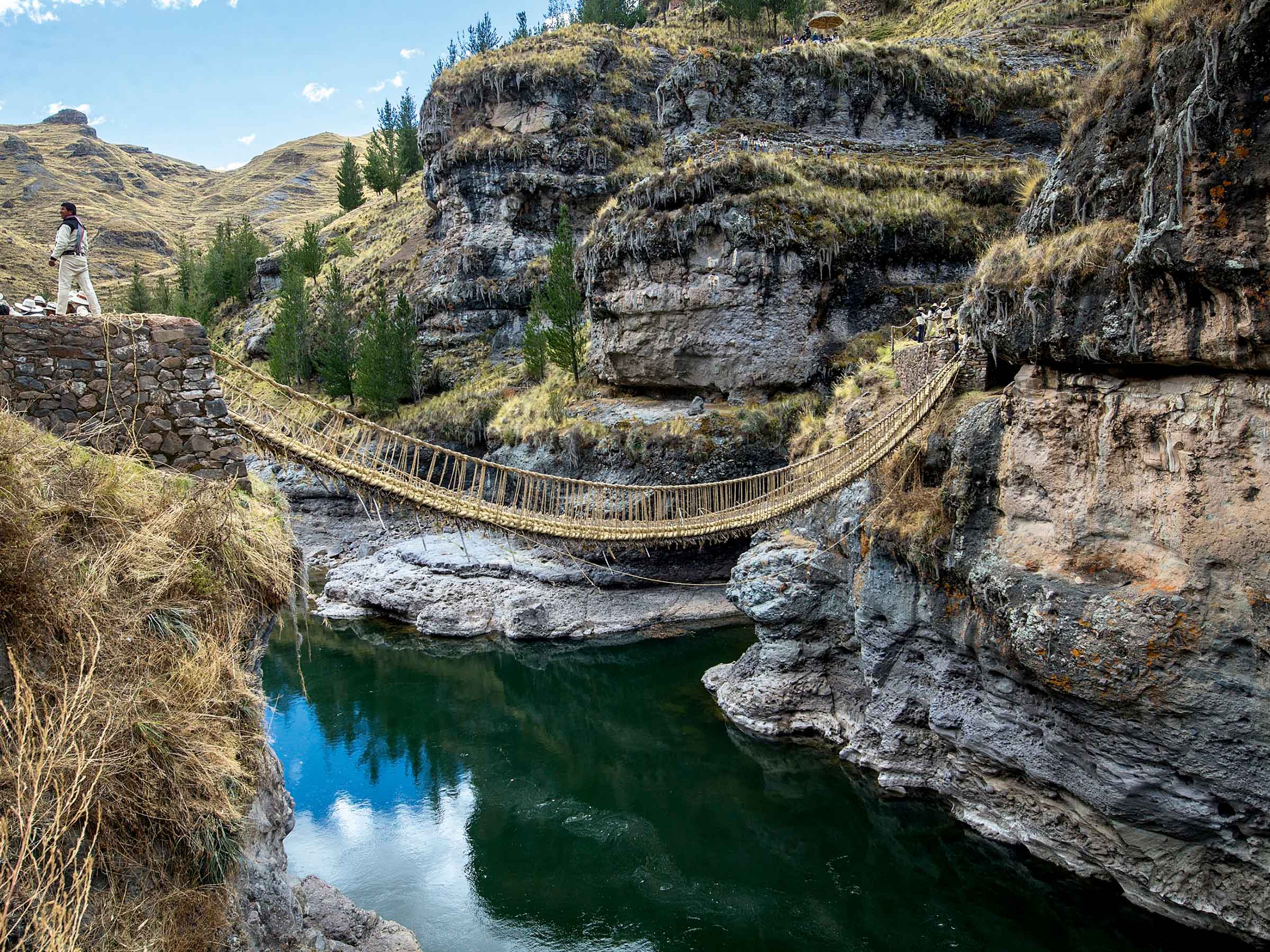Admira y cruza el último puente inca de cuerda tejido a mano.
